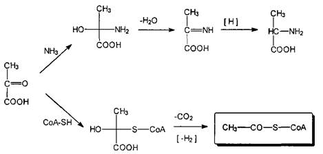 Пировиноградную кислоту следует выделить из всех б-оксокислот еще и как источник весьма существенных биологически активных соединений, получаемых in vivo в результате реакции нуклеофильного присоединения по карбонильной группе и последующих преобразований. С таким реагентом как аммиак, она в несколько стадий, включая еще реакции дегидратации и восстановления, образует важную б-аминокислоту аланин; а при взаимодействии с тиолом ферментной природы, коферментом-А, через стадии присоединения, декарбоксили-рования и восстановления, образует ацетилированный кофермент-А — важнейший интермедиат многих биосинтетических реакций.