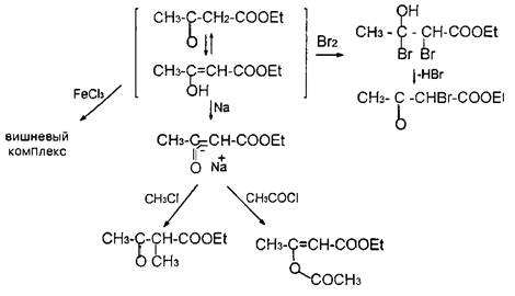 Процесс является обратимым, поскольку гидроксил при тригональном углероде всегда достаточно кислый и его протон может осуществлять, в свою очередь, электрофильную атаку по С=С связи. Оба эти процесса совершаются столь медленно, что тау-томеры могут быть разделены либо кристаллизацией, либо фракционной перегонкой Но через некоторое время индивидуальные изомеры при стоянии снова превращаются в равновесную смесь соединений кетонной и енольной структуры Таким образом, ацетоуксусный эфир, кроме свойств кетонов и сложных эфиров, обнаруживает еще свойства непредельных соединений, спиртов и фенолов, так как гидроксил при двойной связи ведет себя так же, как и при ароматическом кольце