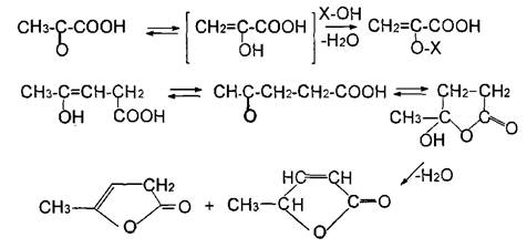 Для г- и д- оксокислот характерны как кето-енольная, так и кольчато-цеп-ная таутомерия. Результатом последней, в случае левулиновой кислоты, является гидроксилактон, наиболее устойчивая таутомерная форма этого соединения, которая достаточно легко отщепляет воду в присутствии водоот-нимающих агентов, образуя непредельные г-лактоны.