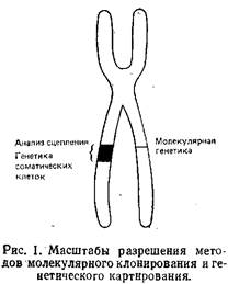 Рис. 2 дает представление о размерах хромосомных сегментов, в пределах которых «работают» различные современные методы генетических исследований. Ось ординат представляет собой логарифмическую шкалу физических расстояний, измеренных в парах нуклеотидов. На шкале приведены и значения генетических расстояний, измеряемые в сантиморганидах. 1 см приблизительно равна 108 п.н. Однако это соотношение нельзя считать универсальным, ибо зависимость между генетическим и физическим расстоянием на хромосоме имеет нелинейный характер, на нее могут оказывать влияние «горячие точки» рекомбинации. Наличие таких областей может привести к ситуации, когда сравнительно большому генетическому расстоянию соответствует небольшой отрезок на физической карте. В то же время в геноме существуют участки, рекомбинация в которых маловероятна, а это приводит к обратной ситуации. Как показано на рис. 2, классические методы молекулярной генетики хорошо работают на последовательностях длиной до 50 г.п.н., что соответствует максимальному размеру вставки в космидный вектор. Участки большей длины можно клонировать путем «прогулки по хромосоме», когда, используя уже клонированные последовательности, геномную библиотеку скринируют с целью получения перекрывающихся клонов. Таким способом удаётся анализировать последовательности длиной до нескольких сотен т. п.н. Однако, в некоторых случаях эта процедура может занять очень много времени. Так будет, если какие-то участки практически не перекрываются из-за наличия протяженной области повторяющихся последовательностей или последовательностей ДНК, которые не удается ввести в стандартные векторы. Если известно, что интересующий нас ген находится на расстояний нескольких сотен т. п.н. от используемого клона, то применение метода «прогулки по хромосоме» весьма проблематично.