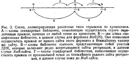 Следует разграничить понятия стандартных геномных библиотек для «прыжков по хромосоме» и специфических библиотек. В первом случае библиотеки создаются таким образом, что начинать движение вдоль хромосомы отмеренными прыжками можно в принципе с любой точки генома. Специфические библиотеки состоят из клонов, позволяющих осуществлять прыжки от одного редко встречающегося сайта рестрикции, например Notl, к последующему такому же сайту. Типы прыжков схематически изображены на рис. 3. Очевидно, что способы создания этих библиотек несколько различаются. С технической точки зрения труднее получать библиотеки первого типа, так как они должны содержать репрезентативную выборку последовательностей генома. Обычно для такой библиотеки требуется 3*108 клонов. Тогда можно быть твердо уверенным, что с ней можно работать, начиная от любой стартовой точки на хромосоме.