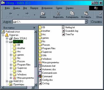 Проводник создает двух панельное окно, отображая содержимое папки на правой панели и ресурсы данного