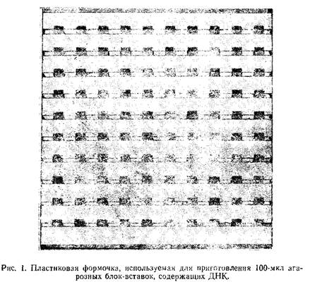 Для предотвращения разрушительного воздействия сдвиговых сил процедуру экстракции ДНК из клеток проводят в присутствии агарозы. Этот прием достаточно прост, и получаемые таким способом образцы можно затем использовать в традиционных электрофоретических опытах и экспериментах по клонированию. Живые клетки суспендируют в расплавленной низкоплавкой агарозе. Затем агарозе дают застыть в формочках объемом 100 мкл для формирования блоков, называемых вставками. Формочки можно приобрести у фирмы Pharma-cia-LKB или сделать самим, соединив вместе «хвост к голове» обычные гребенки для электрофореза нужных размеров. Все манипуляции с формочками следует проводить так, чтобы предотвратить их загрязнение нуклеазами. Перед употреблением формочки необходимо тщательно промыть дистиллированной водой и вытереть, одев перчатки. Затем одна сторона формочки заклеивается лентой, используемой в качестве донышка.