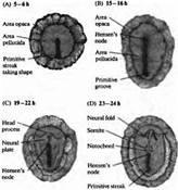 Рис. 1. Ранний морфогенез в эмбрионе позвоночного. Вид сзади на развивающийся эмбрион цыпленка в первый день жизни. (А) 5-6 ч.: образование и удлинение первичной полоски (В) 15-16 ч.: образование первичного желобка и Гензеновского узелка. (С) 19-22 ч.: образование головного отростка и нервной пластинки. (D) 23-24 ч.: образование нервного валика, хорды и мезодермальных сомитов.
