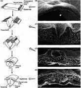 Рис. 2. Образование нервной трубки в эмбрионе цыпленка. (А) Диаграмма нейруляции (В-Е) Микрофотограммы образования нервной трубки, сделанные при помощи сканирующего электронного микроскопа. (В) Нервная пластинка, образованная продолговатыми клетками в дорзальной области эктодермы. (С) Нервный желобок, образованный продолговатыми неирозпителиальными клетками и окруженный мезенхимальными клетками. (D) Нервные валики, покрытые уплощенными зпидермальными клетками. (Е) Нервная трубка, покрытая эпидермисом с расположенными по обеим сторонам сомитами и хордой внизу.