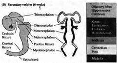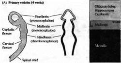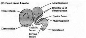 По мере развития в передней (головной или ростральной) части нервной трубки формируется серия утолщений, сужений и изгибов, образующих отдельные анатомические области мозга (рис. 3). Каудальная часть нервной трубки остается относительно простой по строению, сохраняя вид полой трубки, и в дальнейшем на ее основе формируется спинной мозг.