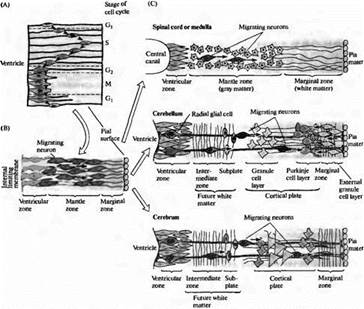Рис. 4. Дифференцировка клеток стенок нервной трубки. (А) Расположение ядер в клетках в первичной нервной трубке в зависимости от стадии клеточного цикла. (В) Клетки, становясь постмитотическими, мигрируют прочь от вентрикулярной зоны и образуют плащевую зону. Их отростки направляются в краевую зону. (С) Трехслойная организация сохраняется в спинном мозге. В мозжечке и головном мозге нейроны мигрируют в краевую зону и образуют там многослойную кору.