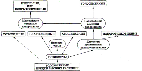 Схема.Эволюция высших растений (Т.А. Козлова, В.С. Кучменко.Биология в таблицах. М.,2000)
