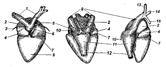 Сердце у амфибий расположено в грудобрюшной полости под грудиной. Его общее строение с дорсальной и вентральной сторон и сбоку (справа) показано на рисунке: 1 - дуги аорты; 2 - правое предсердие; 3 - щетинка, проведенная в отверстие под артериальным стволом; 4 - луковица аорты (артериальный конус); 5 - левое предсердие; 6 - артериальный ствол; 7 - венечная борозда; 8 - желудочек; 9 - передние (краниальные) полые вены; 10 - легочные вены (на виде сбоку только правая вена); 11 - венозный синус; 12 - задняя (каудальная) полая вена; 13 - наружная яремная вена; 14 - безымянная вена; 15 - подключичная вена).