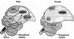 Рис. 3 Половой диморфизм в головном мозге птиц. Схематическая диаграмма основных зон мозга и путей, участвующих в формировании песни у певчих птиц. Высший вокальный центр (HVC), крепкое ядро архистриатума (RA) и подъязычное ядро формируют задний вокальный моторный путь (показано черным). HVC, зона X, медикальное дорзолатеральное ядро тала муса (DLM) и латеральное магноцеллюлярное ядро переднего неостриатума (LMAN) образуют передний путь (показано серым). HVC, подъязычное ядро и RA имеют значительно большие размеры у самцов; зона X не обнаруживается в мозге самок зябликов. Fig. 23.14. Sexual Dimorphism in the Avian Brain. Schematic diagram of the major brain areas and pathways involved in production of song in songbirds. |