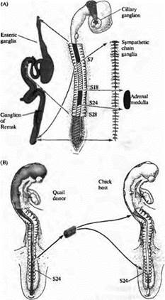 Рис. 5. Судьба клеток нервного гребня определяется окружением. (А) Клетки нервного гребня образуют большое количество различных периферических ганглиев. Ресничный ганглий образован клетками из мезенцефального нервного гребня. Ганглий Ремака и кишечные ганглии тонкой кишки образуются из клеток вагальной (сомиты 1-7) и люмбосакральной (каудальнее S28) областей нервного гребня. Ганглии симпатической цепочки происходят из всех областей нервного гребня каудальнее S5. Надпочечник заселяется клетками нервного гребня из S18-S24. (В) Если клетки нервного гребня из S18-S24, которые должны образовать надпочечник, пересадить от донора-перепелки в вагальную или люмбосакральную область эмбриона цыпленка, они будут следовать пути развития, характерному для своего нового положения и заселят ганглий Ремака или кишечный ганглий тонкой кишки. |
