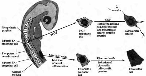 Рис. 6. Определение направления развития клеток нервного гребня, образующих симпатоадреналовую (SA) систему. Плюрипотентные клетки нервного гребня образуют бипотентные SA клетки-предшественники. Судьба SA клеток-предшественников зависит от сигналов извне. SA клетки-предшественники, которые мигрируют в область надпочечника, подвергаются влиянию глюкокортикоидов, ингибирующих нервную дифференцировку и способствующих дифференцировке их в хромаффинные клетки. Альтернативным образом, SA клетки-предшественницы, которые мигрируют в область развивающейся симпатической цепочки, подвергаются воздействию основного фактора роста фибробластов, который приводит к экспрессии ФРН в SA предшественниках. Последующее действие ФРН приводит к тому, что клетки, нечувствительные к дифференцировке в ответ на глюкокортикоиды, начинают дифференцироваться в симпатические нейроны. |