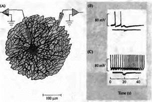 Однако, если нейроны вырашивались в присутствии определенных типов ненейрональных клеток, таких как клетки сердечной мышцы или потовых желез, нейроны постепенно переставали синтезировать катехоламины и начинали синтезировать вместо этого фермент холинацетилтрансферазу и ацетилхолин. Для того, чтобы окончательно установить, что подобные изменения возможны в одиночных нейронах, они культивировались на микроостровках клеток миокарда (рис. 7). Нейроны быстро вытягивали свои отростки и образовывали синаптические контакты с клетками миокарда. Сначала эти синапсы были чисто адренергическими, затем, по прошествии нескольких дней, клетки начинали выделять вместе норадреналин и ацетилхолин. В конечном счете передача становилась полностью холинергической.