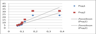 Рис2. Калибровочная кривая для жлтых пигментов (ряд1 – каротиноиды, ряд2 – виолоксантин)