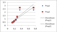 Рис1. Калибровочная кривая для зеленых пигментов (ряд1 – хлорофилл а, ряд 2 – хлорофилл в)