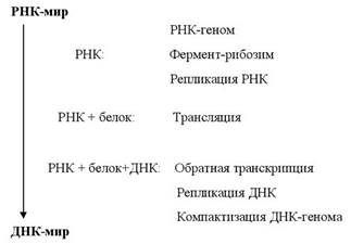 Предполагаемый порядок появления функций живого такой: каталитические функции рибозимов и репликация РНК, затем добавляется трансляция, затем добавляется обратная транскрипция и транскрипция РНК на ДНК, после этого ДНК-репликация. Позже всего возникла компактизация ДНК (напомню, мы говорили на одной из лекций о белках-гистонах и нуклеосомах, которые выполняют обеспечивают компактизацию в эукариотической клетке). Компактизация ДНК позволила увеличить размер генома.