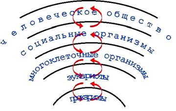 Мы говорили об этапах развития жизни на земле, говорили, что сначала появились прокариоты, затем эукариоты, многоклеточные, затем социальные организмы, затем человеческое общество. Иногда задают вопрос: а почему бактерии еще существуют? Почему более совершенные организмы (эукариоты) не вытеснили прокариот. На самом деле эукариоты не могут жить без прокариот, ведь эукариоты возникли на Земле, где уже жили бактерии, они встроены в эту систему. Эукариоты едят бактерий, потребляют то, что сделали бактерии, они приспособлены именно к жизни, которую им создали бактерии. Если прокариот убрать, то рухнет фундамент жизни на Земле. Каждый новый, более сложный интегративный уровень жизни возникал на основе уже сложившейся предшествующей системы, приспосабливался к ней, и без нее существовать уже не мог.