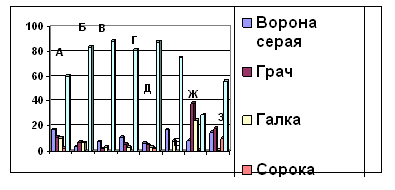 Рисунок 3.4 - Представительство врановых птиц в каждом из биотопов