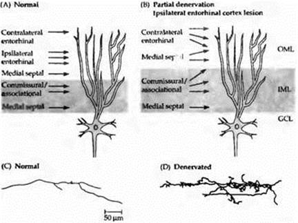 Рис.1. Спраутинг аксонов в ЦНС млекопитающих. (А) Типичная гранулярная клетка зубчатой фасции на ее дендритах во внешнем молекулярном слое (OML) получает множественные сина птические входы от ипсилатеральной энторинальной коры головного мозга и единичные входы от контралатеральной коры и медиальной перегородки. Дендриты внутреннего молекулярного слоя (IML) получают входы от медиальной перегородки и коммиссуральных/ассоциативных волокон. GCL= гранулярный клеточный слой. (В) Удаление ипсилатеральной энторинальной коры приводит к интенсивному росту аксонов нервных клеток энторинальной коры с контралатеральной стороны и замещению ипсилатерального энторинального входа в OML. Наблюдается также спраутинг аксонов, приходящих в DML от медиальной перегородки. Коммиссуральные/ассоциативные волокна в IML расширяют зону иннервации. (С, D) Примеры терминальных разветвлений аксонов от контралатеральной энторинальной коры в OML зубчатой фасции. (С) Норма. (D) Два месяца спустя после повреждения ипсилатеральной энторинальной коры. |