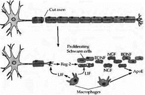 При повреждении периферического нерва в зоне повреждения активируются факторы, стимулирующие пролиферацию шванновских клеток. Они включают два цитокина: фактор, ингибирующий лейкемию (ФИЛ), и Reg-2, являющийся потенциальным митогеном шванновских клеток (см. рис. 2). Reg-2 специфически экспрессируется в развивающихся и регенерирующих двигательных и чувствительных нейронах, и эта экспрессия усиливается ФИЛ. Антитела к Reg-2 замедляют регенерацию после передавливания седалищного нерва.