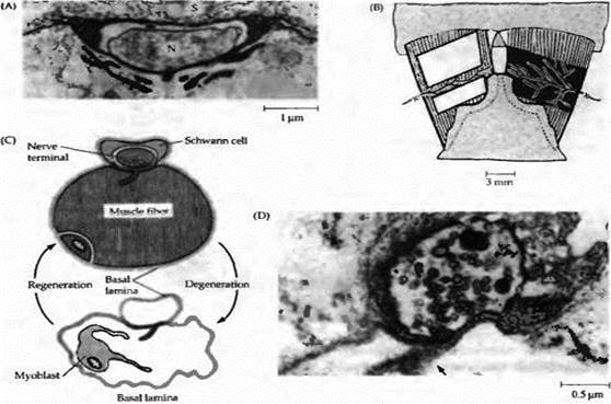Рис. 4. Базальная мембрана и регенерация синапсов. (А) Микрофотография нормального нервно-мышечного синапса лягушки, окрашенного рутением красным, показывающая базальную мембрану, погруженную в постсинаптические складки и окружающую шванновскую клетку (S) и нервное окончание (N). (В) Изображение кожно-грудной мышцы, показывающее замороженный (справа) или перерезанный (слева) участок, с целью вызвать локальное повреждение мышечных волокон. (С) Замораживание приводит к дегенерации и фагоцитозу всех клеточных элементов нервно-мышечного соединения, оставляя целой только базальную мембрану мышечного волокна и шванновской клетки. Новые нервно-мышечные синапсы создаются регенерирующими аксонами и мышечными волокнами. (D) Нерв и мышца были повреждены, регенерация мышечных волокон предупреждена рентгеновским облучением. В отсутствие мышечных волокон аксоны регенерировали, восстанавливали связь с исходными синаптическими зонами и формировали активные зоны. |