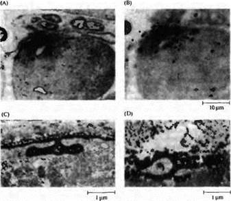 Рис. 5. Аккумуляция AX рецепторов и ацетилхолинэстеразы в исходных синаптических зонах мышечных волокон, регенерирующих в отсутствие нерва. Мышца была заморожена, как на рис. 24.13В, но регенерация нерва была блокирована. Новые мышечные волокна сформировались в пределах оболочек базальной мембраны. (А и В) Ауторадиография регенерированной мышцы с окраской на холинэстераэу, для того чтобы выделить исходную синаптическую зону (в фокусе в части А), и помеченной радиоактивным -бунгаротоксином, чтобы определить положение АХ рецепторов (серебряные зерна в фокусе в части В). (С) Электронная микрофотография исходной синаптической зоны в регенерированной мышце, отмеченная пероксидазой хрена (HRP), конъюгированной с -бунгаротоксином. Распределение АХ рецепторов обнаруживается по высокой плотности продукта реакции с HRP, который позволяет различать поверхность мышечного волокна и синаптические складки. (D) Электронная микрофотография исходной синаптической зоны в регенерирующей мышце с окраской на холинэстеразу. |