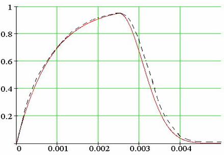 (Сплошной линией показан график выходного сигнала, построенный при помощи ЭВМ; пунктиром показан график выходного сигнала, построенный на основе экспериментальных данных).