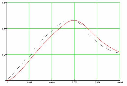 (Сплошной линией показан график входного сигнала, построенный при помощи ЭВМ; пунктиром показан график входного сигнала, построенный на основе экспериментальных данных).