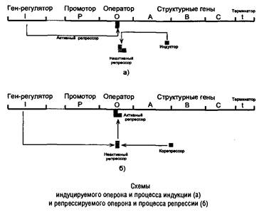 В индуцируемом опероне ген-регулятор кодирует активный реп-рессор, который блокирует транскрипцию, взаимодействуя с операторным участком ДНК и препятствуя продвижению РНКП. Индуктор, представляющий собой исходный субстрат данного метаболического пути или близкое к нему соединение, способен взаимодействовать с репрессором и инактивировать его, освобождая таким образом операторный участок ДНК. В результате РНКП начинает транскрипцию данного оперона. Эти события отражены в схеме.