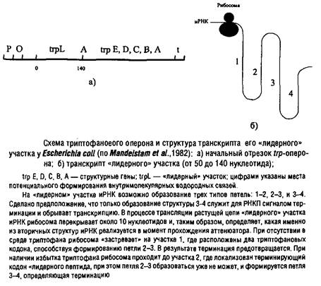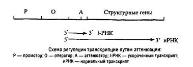 Наряду с этим в составе ряда регулонов обнаружены так называемые аттенюаторы, т.е. участки ДНК, вызывающие преждевременную терминацию, также р-зависимую. Эти генетические элементы располагаются между оператором и первым структурным геном в регулонах, контролирующих биосинтез ряда аминокислот. Все аминокислотные регулоны, управляемые с помощью аттенюации, характеризуются обогащением участка и РНК, соответствующего расстоянию до аттенюатора кодонами той аминокислоты, которая служит отрицательным эффектором.