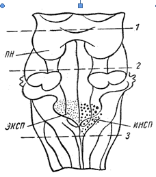 Рисунок 1 – Локализация дыхательных центров На рисунке – нижняя часть ствола мозга (вид сзади). ПН – центр пневмотаксиса; ИНСП – инспираторный центр; ЭКСП – экспираторный центр. Центры являются двусторонними, но для упрощения схемы на каждой из сторон изображен только один из центров. Перерезка выше линии 1 на дыхании не отражается. Перерезка по линии 2 отделяет центр пневмотаксиса. Перерезка ниже линии 3 вызывает прекращение дыхания