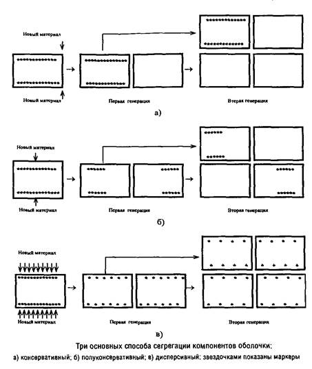 Можно представить себе три основных способа локализации сайтов включения предшественников: консервативный, полуконсервативный и дисперсивный. В первом случае после второй генерации лишь четверть клеток содержит маркеры, во втором случае – половина клеток, а в третьем – все клетки.