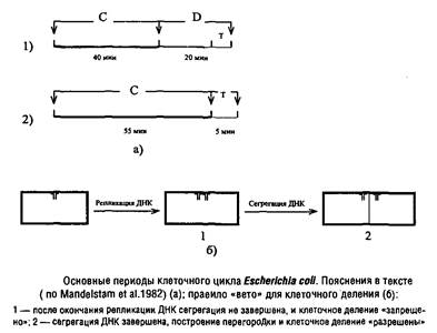 Для нормального протекания клеточного цикла необходимо, чтобы в период С происходила не только репликация ДНК, но и синтез белка и РНК, так как ингибиторы транскрипции и трансляции, введенные в течение периода С, тормозят клеточное деление и увеличивают время генерации. Если же ввести эти ингибиторы на период, не превышающий 15 мин., деление клетки завершается вовремя. Очевидно, что минимальная длительность периода D может быть равна периоду Т, т.е. времени, необходимому для сборки перегородки. Эти выводы подтверждаются фактом, что данные ингибиторы, введенные в период D, не тормозят клеточное деление. Следовательно, предшественники, необходимые для построения клеточной перегородки, и другие белки, важные для завершения деления клетки, синтезируются в период С и хранятся в резерве до начала сборки перегородки.