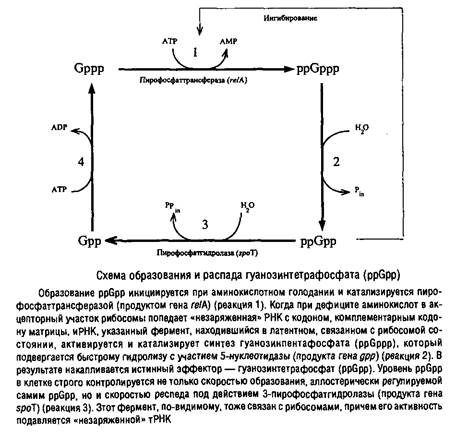 Дефицит энергии также тормозит гидролиз ppGpp, так как активность пирофосфатгидролазы АТР-зависима. Таким образом, при аминокислотном голодании не только стимулируется синтез PpGpp, но и тормозится его гидролиз.