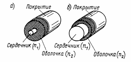 Рис. 2.3 - Одномодовое (а) и многомодовое (б) оптическое волокно |