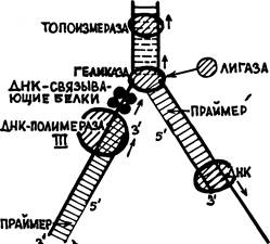 Между тем праймер, оставшийся в начале 1-й нити разрушается некой «рибонуклеазой Н», — ферментом, рвущим нить РНК, находящуюся в комплексе с нитью ДНК. На его место ДНК-полимераза II ставит «правильные» дезоксирибонуклеотиды. В то же время топоизомераза, геликаза, а за ними и ДНК-полимераза III продвигаются вперед.