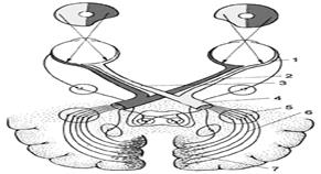 1 - сетчатка, 2 - неперекрещенные волокна зрительного нерва, 3 - перекрещенные волокна зрительного нерва, 4 - зрительный тракт, 5 - наружнее коленчатое тело, 6 - radiatio optici, 7 - lobus opticus
