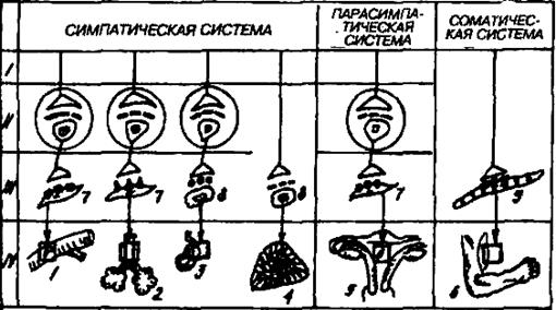 С точки зрения иерархии управления все образования ВНС условно делят на этажи. 1-й этаж представлен интрамуральными сплетениями (метасимпатическая нервная система). 2-й этаж представлен паравертебральными и превертебральными ганглиями, в которых могут замыкаться вегетативные рефлексы, независимо от вышерасположенных образований. 3-й уровень – центральные структуры симпатической и парасимпатической системы (скопление прсганглионарных нейронов в стволе мозга и спинном мозге). 4-й этаж представлен высшими вегетативными центрами – гипоталамусом, ретикулярной формацией, мозжечком, базальными ганглиями, корой больших полушарий.