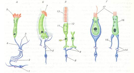 1 — митральная клетка, 2 — обонятельный клубочек, 3 — обонятельные нити, 4 — аксон, 5 — реснички, 6 — волокна chorda tympani 7 — микроворсинки, 8 — биполярная клетка, 9 — волокна, 10 — ядро, 11 — внутренний членик, 12 — рудимент реснички, 13 — наружный членик, 14 — эфферентное нервное волокно. 15 — эфферентный аксон, 16 — наружная волосковая клетка (улитка), 17 — волоски
