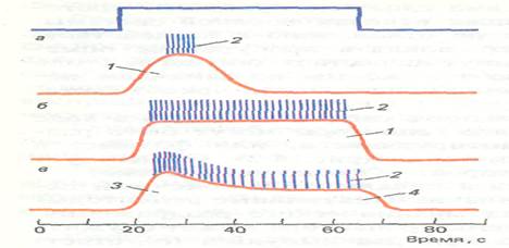 Рис. 2. Реакции фазных (а), тонических (б) и фазно-тонических (в) рецепторов при стационарном раздражении: I — рецепторный потенциал, 2 — спайковая активность, 3 — фазовый компонент ряцепторного потенциала, 4 — тонический компонент рецепторного потенциала; вверху показана отметка раздражения