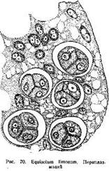 В периплаэмодиальном тапетуме стенки его клеток, иногда уже на ранних стадиях развития спорангия, расплываются к их протопласты сливаются вместе в одну сплошную массу, имеющую характер многоядерного плазмодия: его называют периплазмодием. После обособления материнских клеток спор, периплазмодий проникает в промежутки между ними, так что материнские клетки оказываются погруженными в плазматическую массу его (рис. 70). По мере развития спор и образования на них сложных оболочек периплазмодий становится все менее густым, в нем появляется много вакуолей. В конце концов, ко Времени вскрывания спорангия, периплазмодий исчезает.