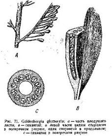 У Goldenbergia glomerata, например, (рис. 71) такой плод представлял собой овальное тело около 6—8 -мм длиной, сидящее на длинной тонкой ножке (10—15 мм). Внутри •его находилась обширная полость, а стенка была построена из вегетативной ткани, в толще которой заключалось 12—18 трубчатых спорангиев. Они располагались в один ряд вокруг центральной полости и содержали в себе довольно крупные микроспоры (0,3—0,4 мм). Внешняя поверхность плода была покрыта короткими шипиками.