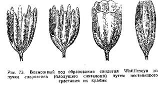 Ход эволюции синангиев Whittleseyinae Т. Галле иллюстрирует следующей схемой (рис. 73). На ней первая фигура изображает гипотетическую исходную форму — плодущий синтелом. Наличие групп спорангиев Psilophyton, сидящих на концах теломов, подтверждает построение такой гипотетической формы. На следующей стадии спорангии срослись в нижней своей половине. Вершины их остаются свободными.