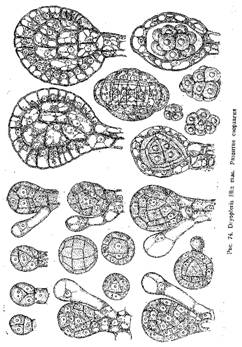Это плодоношение типа Codonotheca. Далее срастание спорангиев идет до их вершин, получается бокаловидный синангии, как у Whittleseya elegans. Наконец, спорангии смыкаются и срастаются своими вершинами —образуется плод, полый внутри со спорангиями, находящимися в его стенке—Aulotheca, Goldenbergia.