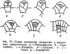 Евопорангиатный тип спорангиев встречается у наиболее древних и примитивных групп среди ныне живущих папоротникообразных. Он же характерен) и для ископаемых папоротникообразных. Это заставляет нас смотреть на евшорангий как на древний, примитивный тип спорангия, от которого уже произошел лептосггорангий, свойственный к тому же более молодым группам папоротников (Filices). Об этом говорит и то, что, как показывают сравнительные исследования, между евопорангиатный я лептоспорангиатным типами развития существует ряд постепенных переходов, связывающих их между собой. Вместе с тем эти переходы указывают на ход эволюции лептоспорангия.