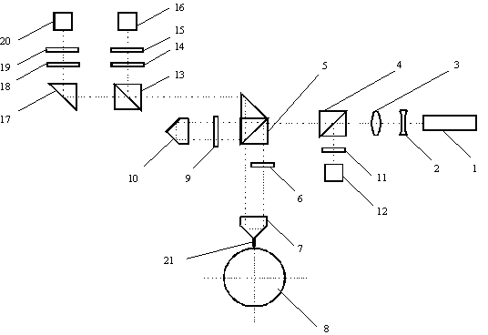 Рис. 2. Оптическая схема интерферометра: 1 — лазер; 2, 3 — линзы; 4, 5, 13 — светочувствительный кубик; 6, 9 — пластинка λ /4; 7, 10 — уголковый отражатель; 8 — фонографический цилиндр; 11, 14, 15, 18, 19 — поляризационный фильтр; 12, 16, 20 — фотодетектор; 17 — призма; 21 — игла.