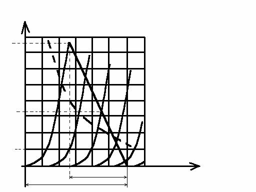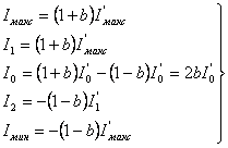 Для расчета коэффициента гармоник двухтактного каскада с несимметричными плечами токи I’макс, I’1, I’0, найденные по статическим характеристикам усилительного элемента, принимают за номинальные и находят пять значений токов Iмакс, I1, I0, I2 и Iмин, предположив, что одно плечо имеет токи в (1+b), а другое в (1-b), отличающиеся от номинальных. Учитывая, что токи второго плеча имеют обратное направление, их считают отрицательными. Остаточный ток покоя I0, вызывающий подмагничивание выходного трансформатора, равен разности токов покоя обоих плеч. В результате получим следующие формулы для вычисления указанных токов: