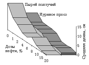 Наблюдения за ростом и развитием растений велись в течение опытов. Одним из наиболее информативных показателей роста растений является их высота. Нефть губительно действует на проросшие растения. При всех концентрациях нефти в начале вегетации рост растений в высоту отставал от контроля, при различных дозах высота растений была в 2 и более раз ниже, чем в контроле (табл. 2, рис. 1). Для пырея установлено, что нефтяное загрязнение почв оказало ингибирующее действие на рост растений в высоту при самой минимальной дозе загрязнителя (0,5 % от веса почвы). Для звездчатки и куриного проса ингибирование роста начиналось с 1 %-й дозы загрязнителя. Нетрудно заметить, что длина надземной части растений в опытных вариантах с увеличением концентрации нефти резко снижается (рис. 2). При загрязнении почв от 6 % до 15 % погибло более 50 % растений. Крайне неблагоприятные условия как для прорастания семян, так и для вегетирующих молодых растений сложились при 20 %-м уровне загрязнения. В этом случае отмечались единичные всходы, которые погибали на 5-8 день после появления. Обращает на себя внимание некоторое увеличение высоты растений при дозах 6-8 %, что можно объяснить предлетальным стрессом у опытных растений (рис. 1).