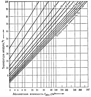 Рис2. Семейство характеристик абсолютной и относительной влажности при различных температурах.