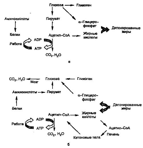 Рисунок 2. Изменение метаболизма основных энергоносителей при смене абсорбтивного (а) и постабсорбтивного (б) состояний.